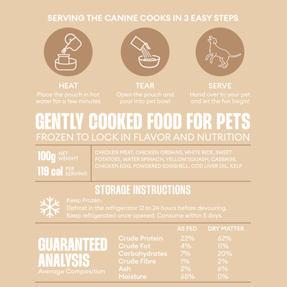 Ingredients: Chicken Meat, Chicken Organs (Gizzard, Liver), White Rice, Sweet Potatoes, Water Spinach, Yellow Squash, Cabbage, Chicken Egg, Carrots, Powdered Eggshell, Cod Liver Oil, Kelp